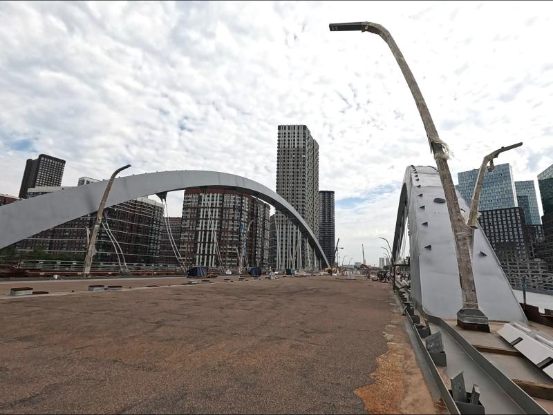 Также на мосту устанавливают мачты освещения и перильные ограждения, продолжают работы по гидроизоляции металлоконструкций и строят съезды на Проектируемый проезд 2017.