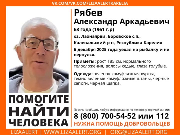 Как сообщает поисковый отряд «ЛизаАлерт в Карелии», Александр Рябев 6 декабря он уехал на рыбалку и пропал.