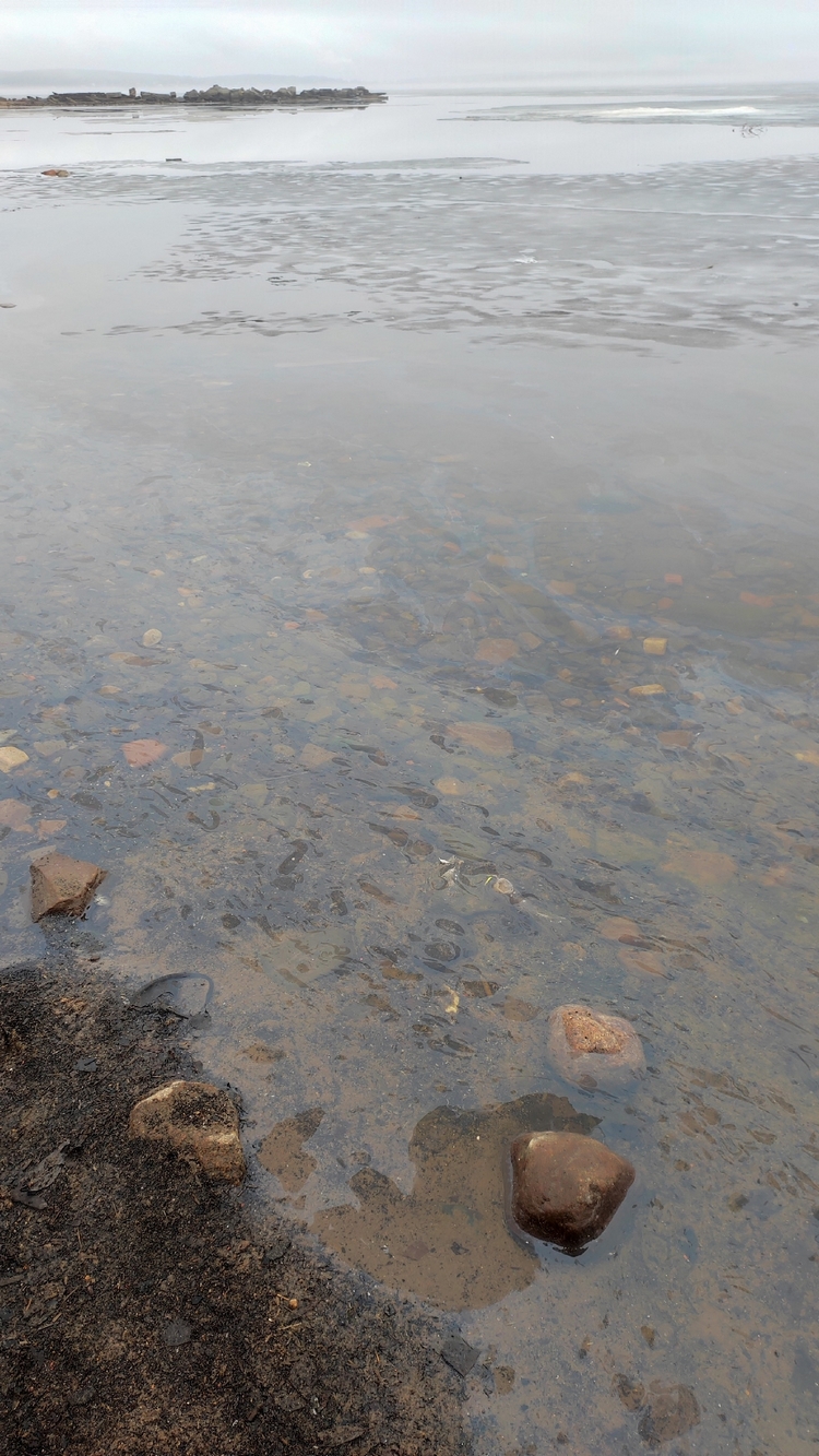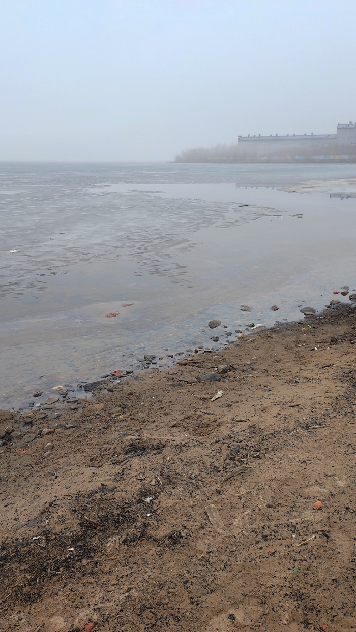 Полгода спустя, 5 апреля 2026 года, на том же популярном у горожан месте отдыха снова видны маслянистые пятна. Рядом — детская площадка и место, где купаются моржи.