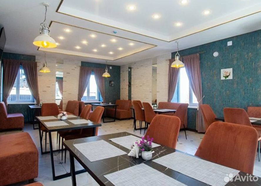 Ресторан обставлен диванами, столами, стульями. Есть три зала, первый рассчитан на 25-30 человек, второй — на 35-40, а третий — на 65-70. На кухне стоят столы из нержавейки, три холодильника, три морозилки, индукционная плита, миксер, мясорубка, пароконвектомат, тестомес, фритюрница, микроволновка и другая техника.