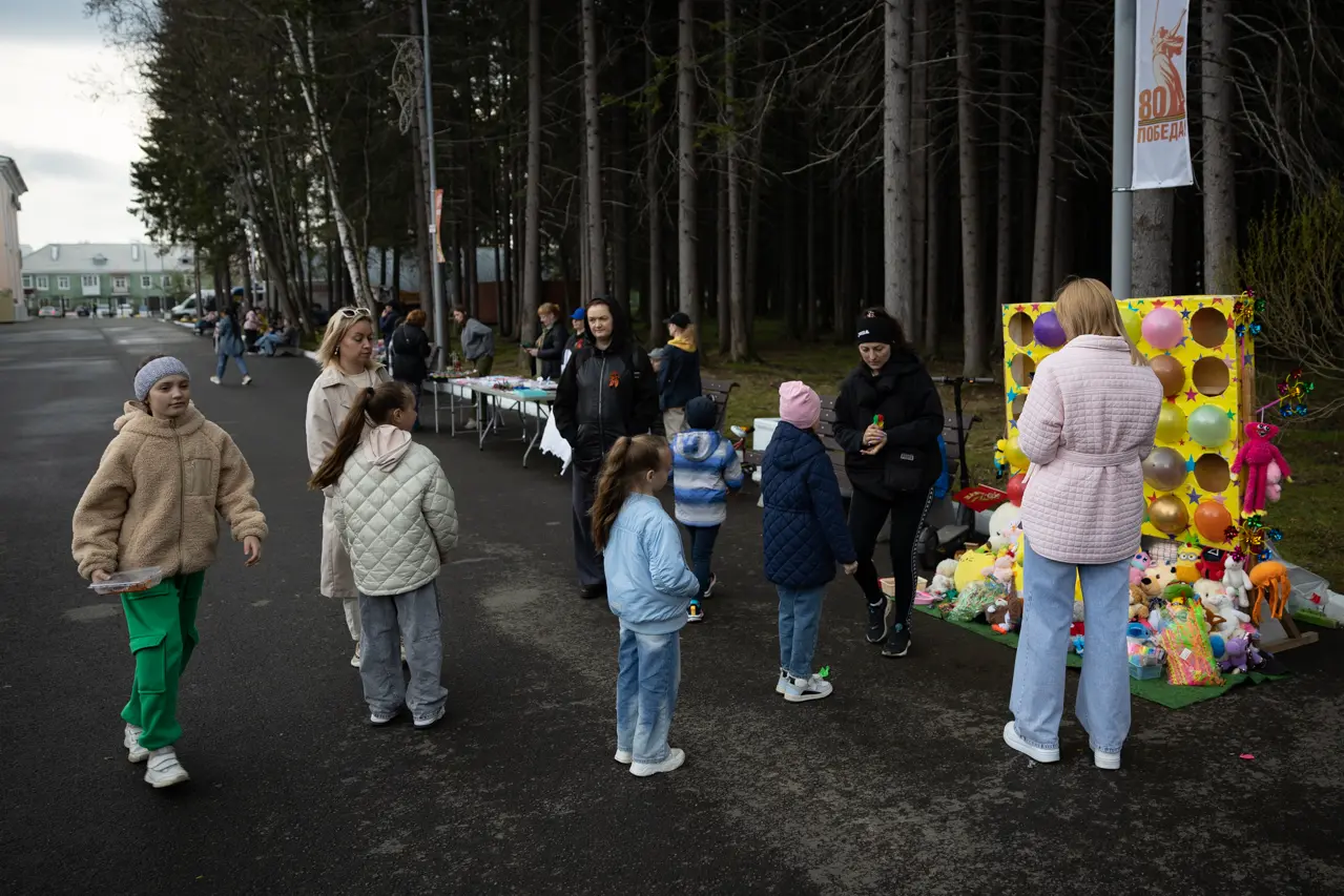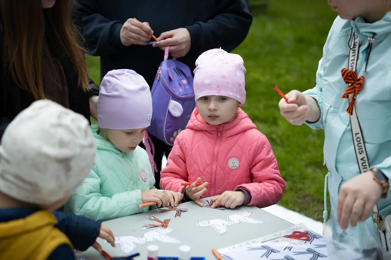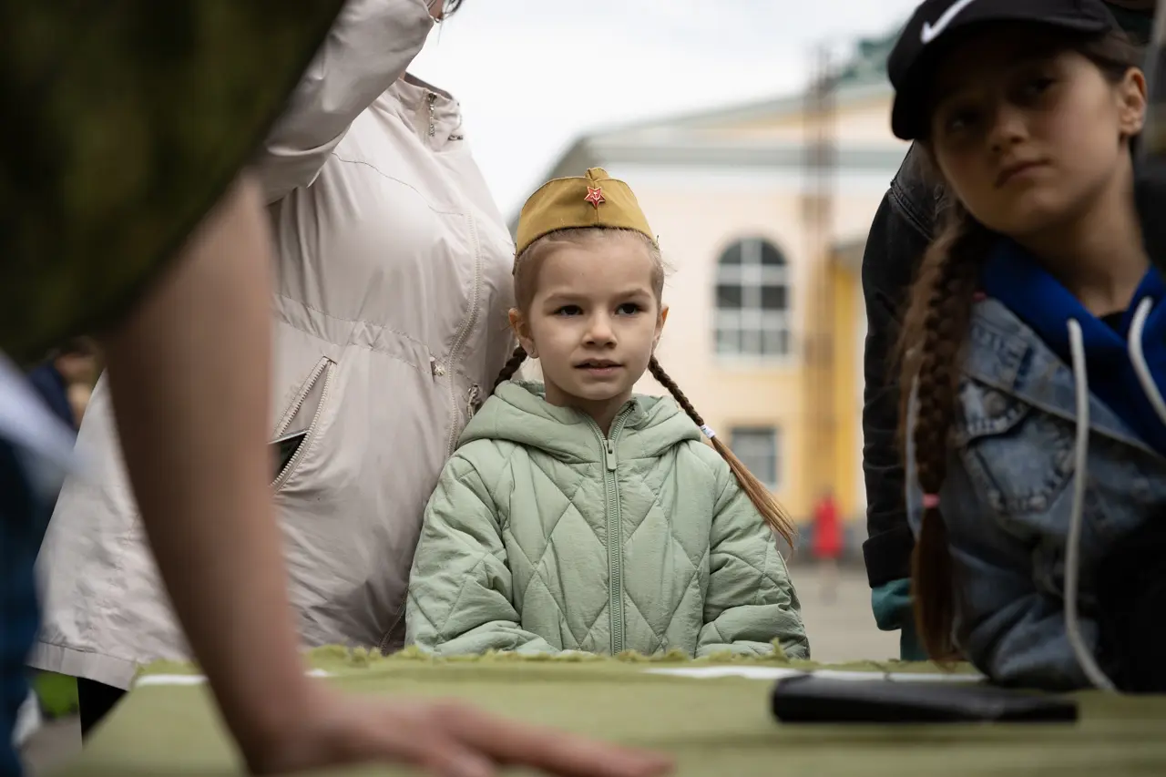 В День Победы у Дворца Культуры пели, собирали автомат и мастерили голубей мира