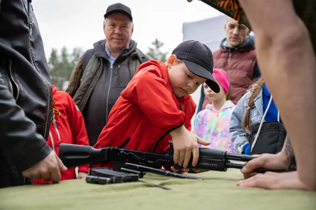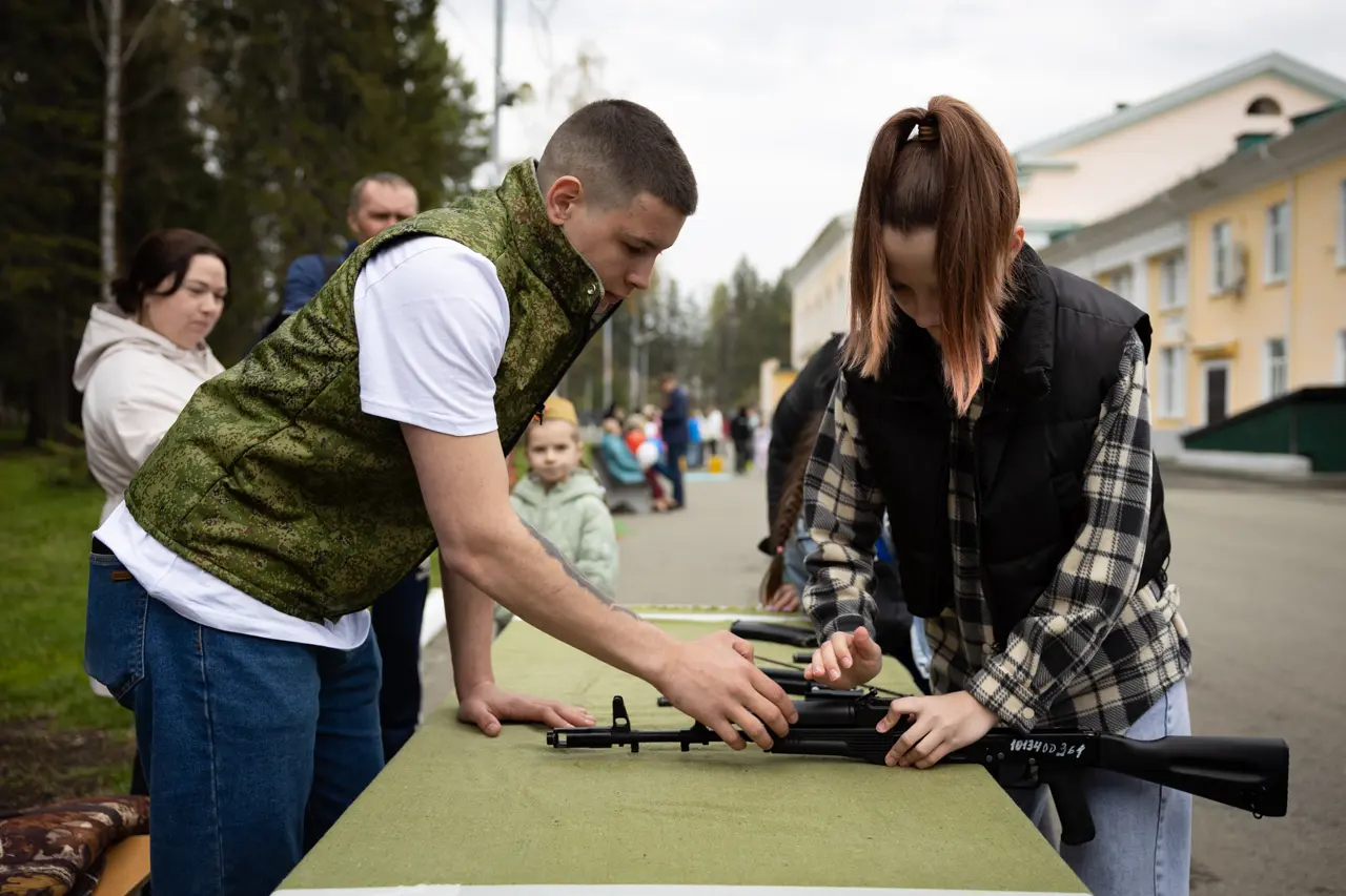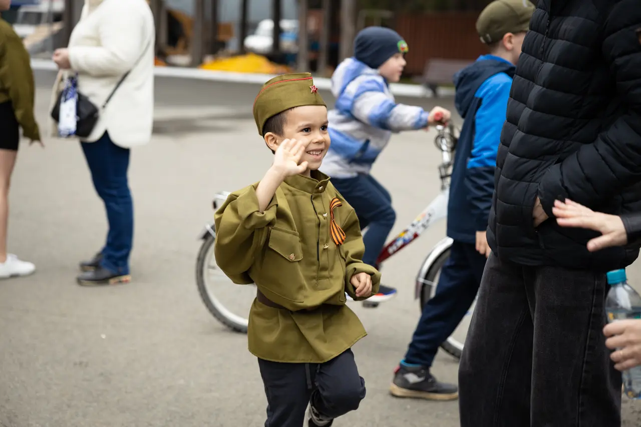 В День Победы у Дворца Культуры пели, собирали автомат и мастерили голубей мира
