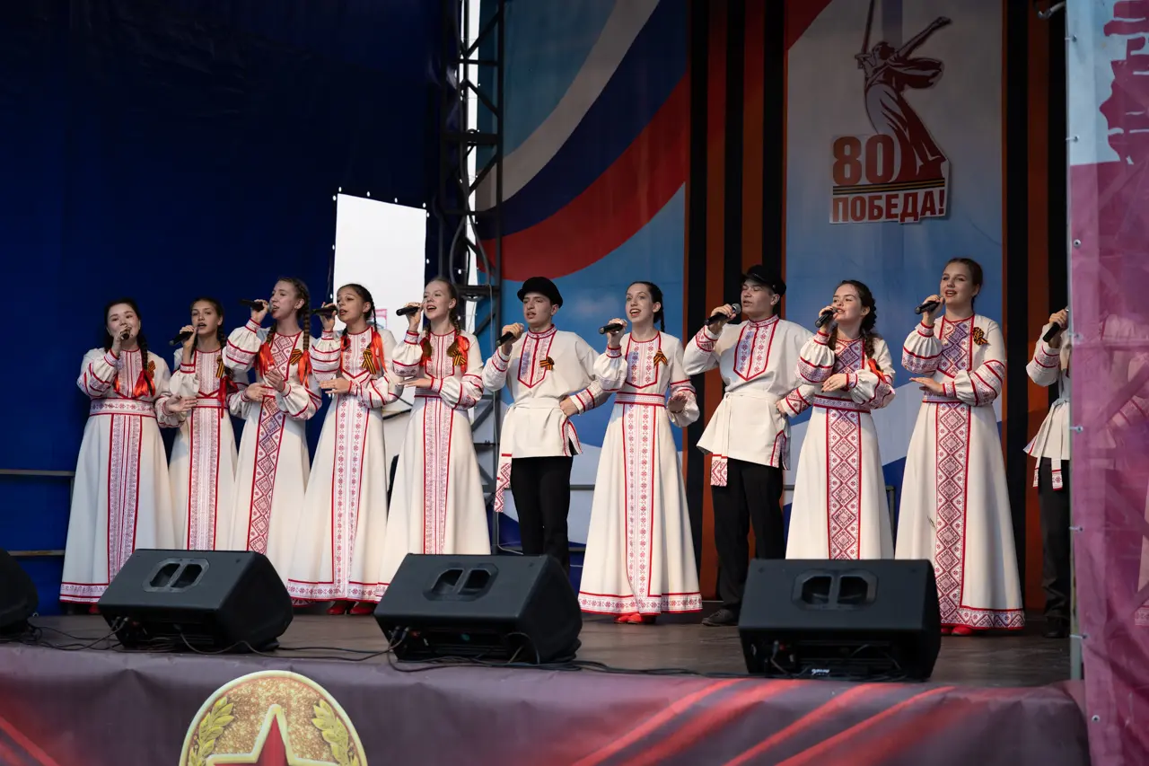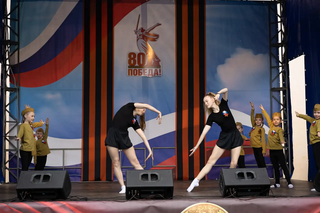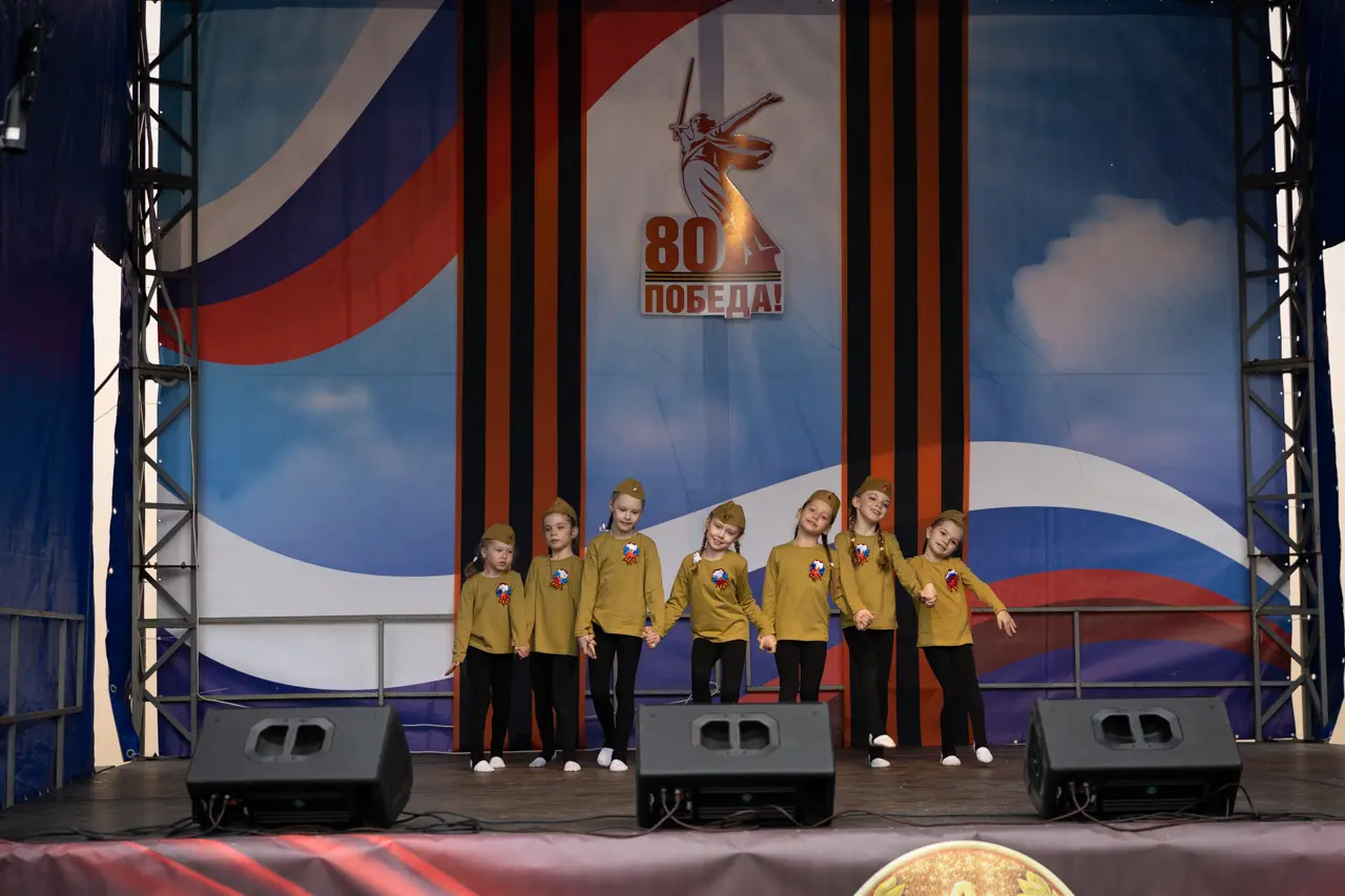 Девочки из модельной школы MAXI MODELS исполнили танец-показ подростковой серии одежды «Цветы России» известного в Ревде дизайнера Ирины Козыриной.Завершился концерт, конечно же, песней “День Победы”, ставшей негласным гимном целой страны на 9 Мая (хотя выпущена она была только в год 30-летия победы, в 1975 году). Ее собравшиеся пели хором.