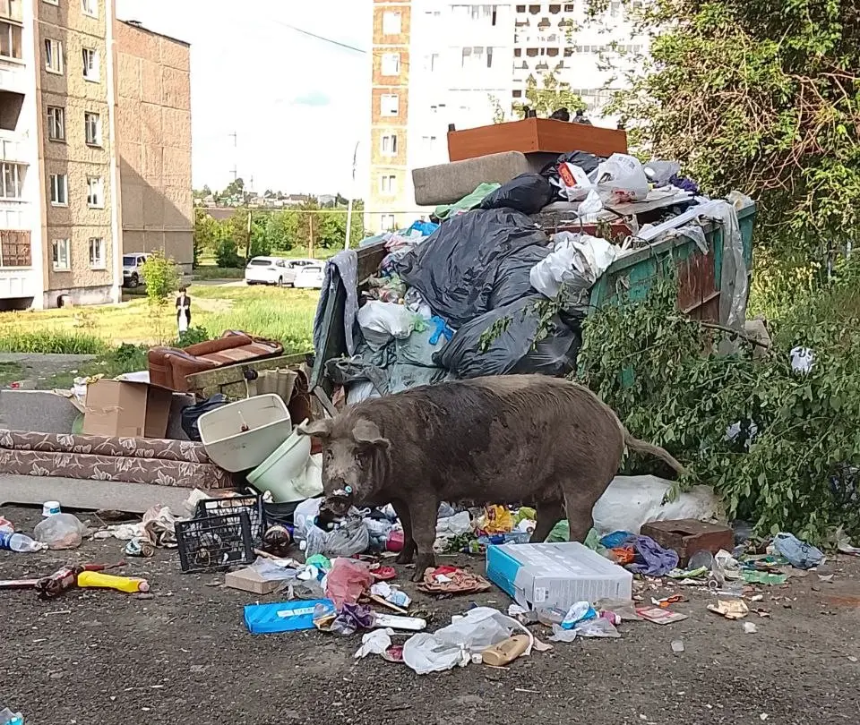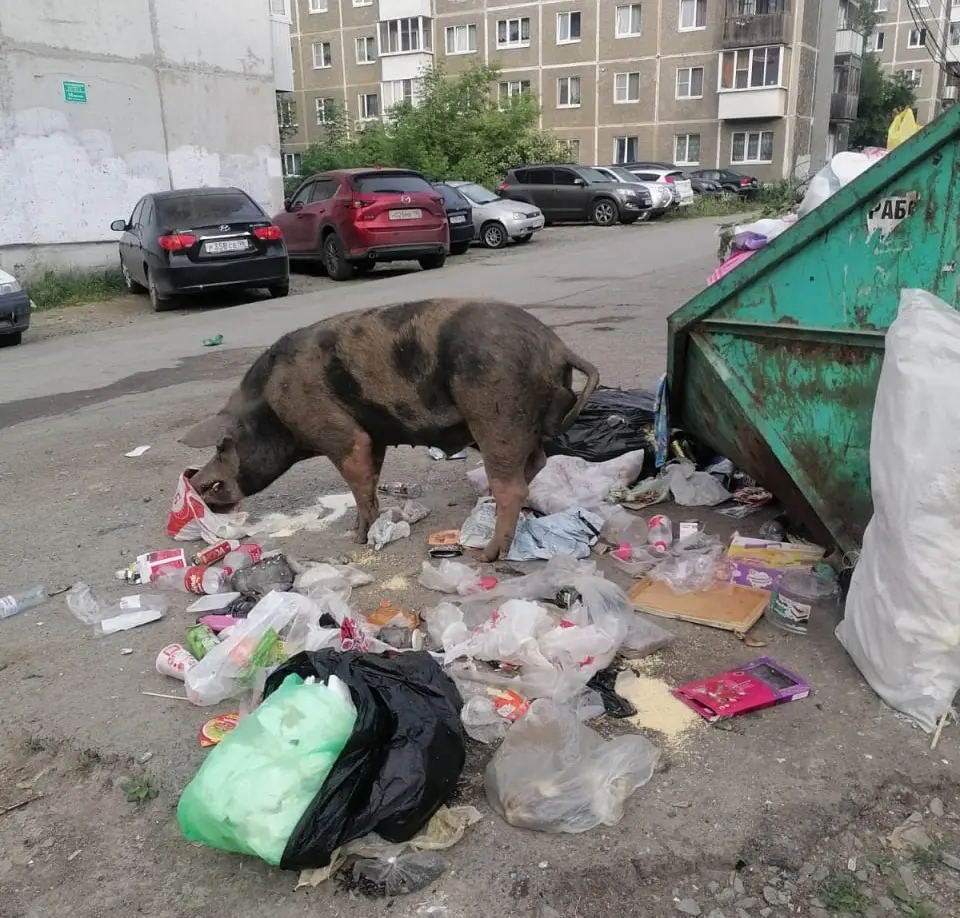 Свиньи едят с помоек — баки для крупногабаритного мусора стоят переполненные, отходы валятся на землю. Спецавтобаза утверждает, что виноваты сами жители: мол, бросают мусор в бункеры, а нужно — в евроконтейнеры. Но это слабое оправдание: люди всегда бросали (и к сожалению будут бросать) свои мешки в «неправильный» бак, однако например еще месяц назад такого ужаса на помойках не было. А свиньям раздолье — они пируют!