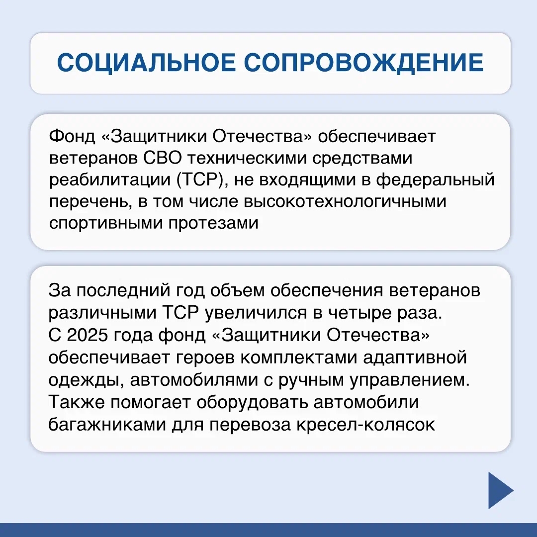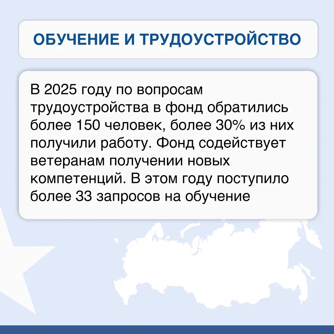 Как сообщается в группе фонда в соцсети, в 2025 году Государственный фонд «Защитники Отечества» при поддержке партнеров создал систему комплексной поддержки участников СВО, вернувшихся домой. В ее основе лежит тесное межведомственное взаимодействие, а главным принципом является индивидуальный подход к человеку, забота о каждом обратившемся ветеране и каждой семье героя.