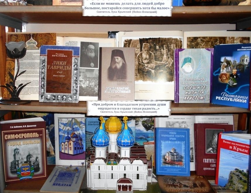 «Откуда берутся в России святые, чья жизнь, словно вечный божественный свет, чья жизнь – житие, время – дни золотые, а суетной жизни как будто и нет?» – эти вопрошающие строки стихотворения Владимира Зыкова посвящены благодарной памяти Святителя Луки (Валентина Феликсовича Войно-Ясенецкого), архиепископа Симферопольского и Крымского, выдающегося хирурга, доктора медицинских наук, профессора, 145-летие со дня рождения которого Россия и весь просвещенный мир отмечают 27 апреля 2022 года. К этой значимой дате библиотека-филиал №4 им. М.М. Коцюбинского ЦБС для взрослых Симферополя приурочила краеведческую выставку духовной памяти «Всегда делать людям добро».