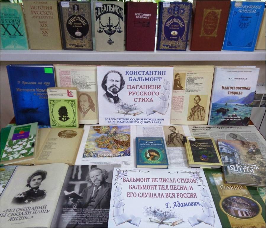 Информационным сопровождением мероприятия стала книжная выставка «Константин Бальмонт: Паганини русского стиха», центральное место на которой заняли краеведческие издания «У времени на юру. История Крыма в русской поэзии», «Крым. Поэтический атлас», «Памятники Большой Ялты» Наталии Гурьяновой и другие.