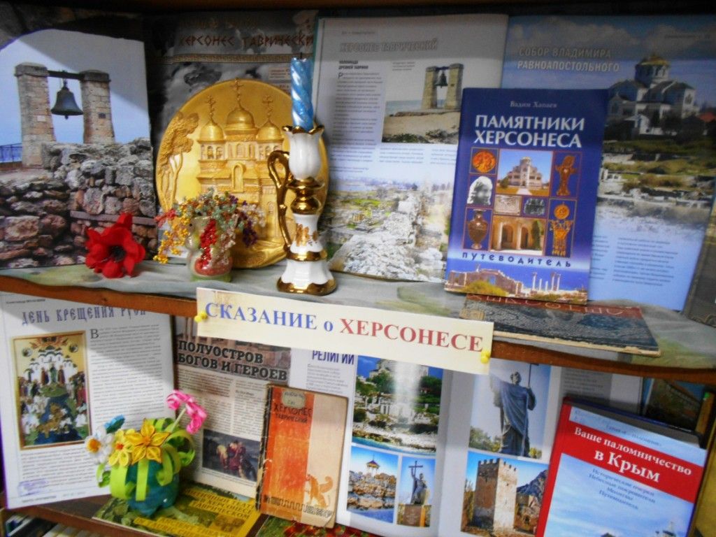 «Бывают края, что недвижны веками, / Зарывшись во мглу и мох. / Но есть и такие, где каждый камень /  Гудит голосами эпох…», – эти строки крымского поэта, симферопольца Ильи Сельвинского стали цитатой краеведческой выставки «Купель державы в крымском Херсонесе», организованной сотрудниками симферопольской библиотеки-филиала №4 им. М. М. Коцюбинского в преддверии одного из самых светлых и значимых праздников – Дня Крещения Руси, который  православный мир отмечает  28 июля.Первый раздел выставки «Как князь Владимир в Корсуне крестился» посвящен истории становления христианства на  Руси, принятия православия нашими прадедами.  Согласно «Житию Святого равноапостольного великого князя Владимира Святославовича»  и историческим свидетельствам, крещение великого князя Владимира состоялось в 988 году в Херсонесе – Корсуни. Принятие христианства князем Владимиром, крещение им русского народа по праву считается настоящим духовным подвигом, равным подвигу святых апостолов, поэтому Святая Церковь называет святого равноапостольным князем. Особое место в этом разделе занимают краеведческие издания «Основы православной культуры Крыма», «Из истории христианства в Тавриде» А.В. Дмитриевой и Т.В. Дмитриевой,  «Сказание о Херсонесе» Александра Байгушева, «Как князь Владимир в Корсуне крестился» Евгения Белоусова и др.