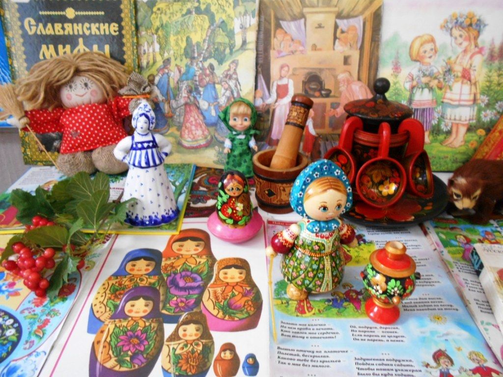 Информационным сопровождением мероприятия стала выставка-экспозиция «Фольклор – душа народа», на которой были представлены издания о традициях русского народа, известных народных обрядах и увлекательных праздниках, народном быте: энциклопедия детского фольклора «Как у наших у ворот…»,   сборники «Русский фольклор», «Русские сказки», «Старинные русские пословицы и поговорки», «Загадки», «Русская старина», «Копилка народной мудрости», «Славянские мифы», «Былины», фольклорные произведения  русского народа. Особое внимание юных россиян привлекли миниатюрные книги из фонда библиотеки, о которых можно с уверенностью сказать «мал золотник, да дорог»: «Цветник мудрости» Матроны Московской и «Что посеешь… то и пожнешь: или детям и внукам в назидание», фигурки Матрешки, Василисы Премудрой, Домовенка с сундучком, Медведя с балалайкой, Аленушки,  предметов народного быта и др.