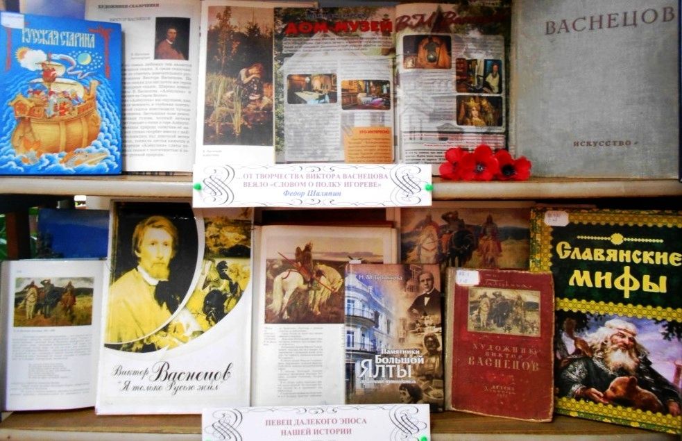 Разделы выставки «Я только сказочник, былинник, гусляр живописи» (Виктор Васнецов), «От творчества Викторова Васнецова веяло “Словом о полку Игореве”» (Федор Шаляпин) и «Певец далекого эпоса нашей истории» знакомят читателей с изданиями из фонда библиотеки, в числе которых: «Виктор Васнецов» Владислава Бахревского из серии «Жизнь замечательных людей», «Художник Виктор Васнецов» Олимпиады Галеркиной, «Виктор Михайлович Васнецов» Николая Моргунова и Наталии Моргуновой-Рудницкой, «Виктор Васнецов» Василия Осокина, «Живая Древняя Русь» Евгения Осетрова,  «Рассказ о русской живописи» Григория Островского, краеведческие издания «Биографический словарь Крыма» Владимира Сухорукова, «Памятники Большой Ялты» Наталии Гурьяновой и др. Выставка повествует о жизненном и творческом пути творца-юбиляра, перу которого принадлежат уникальные картины на темы русских былин и народных сказок, национальной истории, и кто одним из первых на своих полотнах оживил волшебный мир русского фольклора. Виктор Михайлович писал: «Я всегда был убеждён, что…в сказке, былине, драме сказывается весь цельный облик народа, внутренний и внешний. С прошлым и настоящим, а, может быть, и будущим… Плох тот народ, который не помнит, не ценит и не любит своей истории». Созданный им мир – источник подлинной веры и поэтических преданий, духовный исторический опыт народа. Миллионам ценителей известны картины Виктора Васнецова «Витязь на распутье», «Ковёр-самолёт», «Три царевны подземного царства», «Кощей Бессмертный», «Спящая царевна», «Летописец Нестор», «Царевна-лягушка» и др. «Богатыри» – самая значительная картина Виктора Васнецова, над которой он работал с перерывами около двадцати лет, настоящая эпическая песнь России, ее великому прошлому.