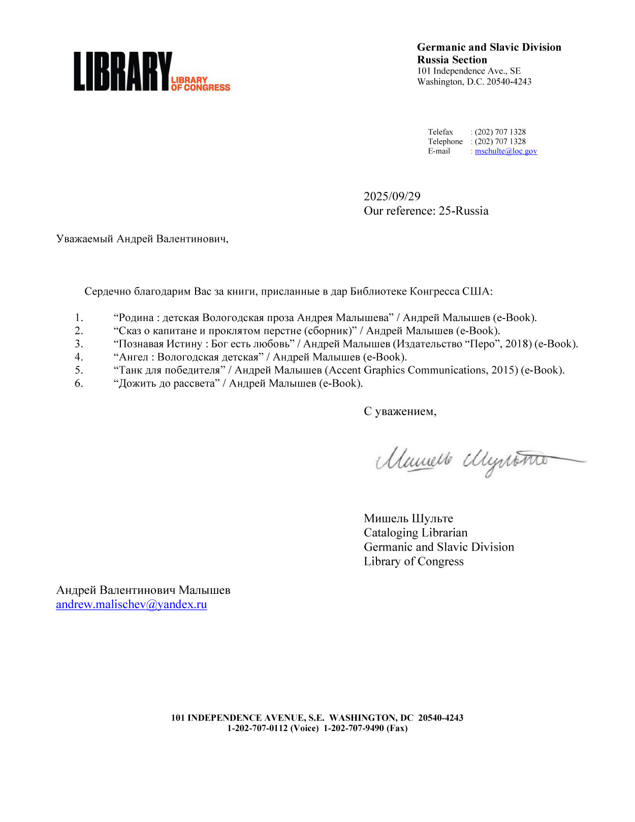 Благодарность Андрею Малышеву от Библиотеки Конгресса США
