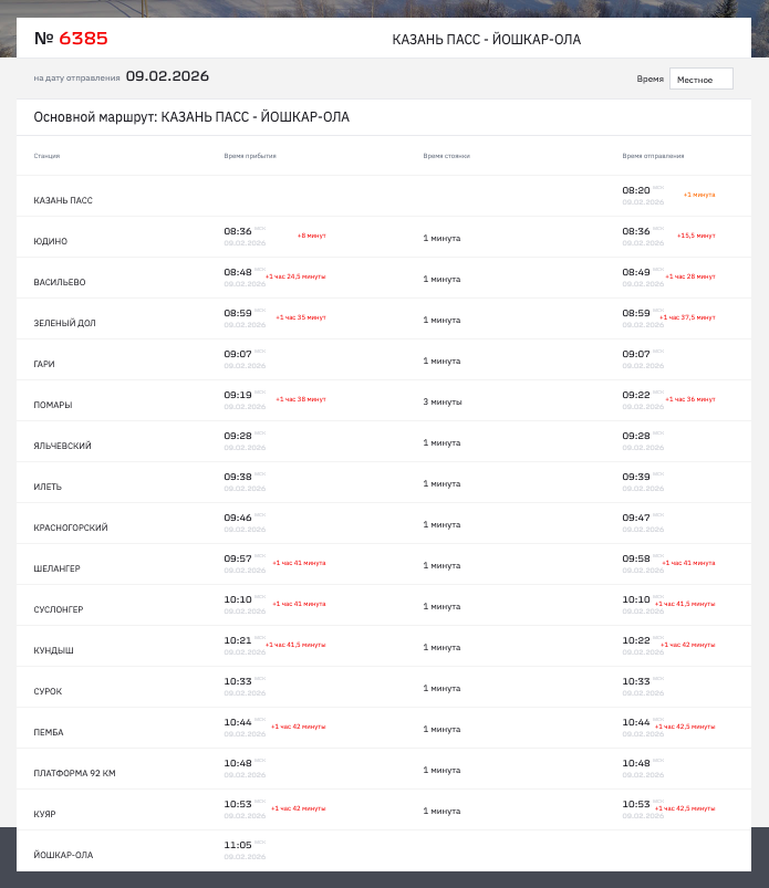 Известно, что состав отправился из столицы Татарстана в 08:36. Судя по онлайн-табло РЖД, в Юдино он прибыл с задержкой на 15,5 минут, а в Васильево на 1 час и 28 минут.